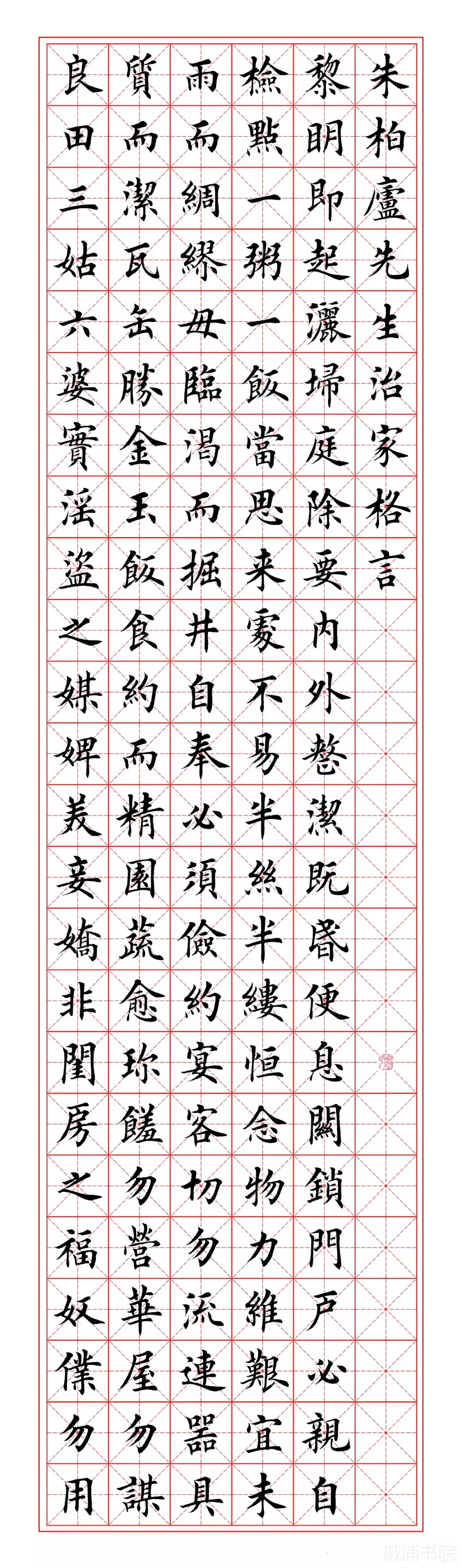 《朱柏庐先生治家格言》黎明即起,洒扫庭除,要内外整洁。既昏便息,关锁门户,必亲自检点。一粥一饭,当思来处不易。半丝半缕,恒念物力维艰。